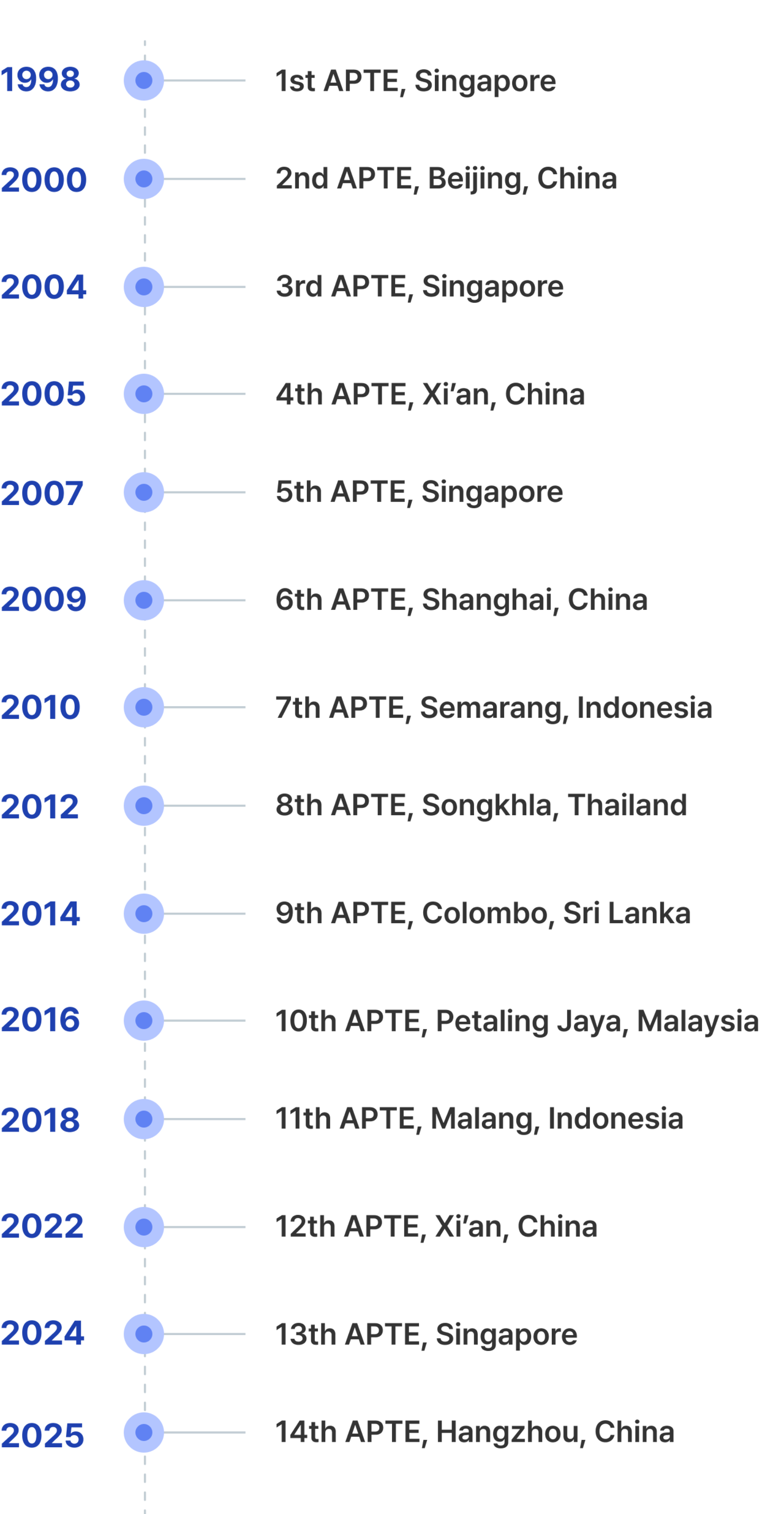 The following are the years and venues of the APTE conferences held so far: